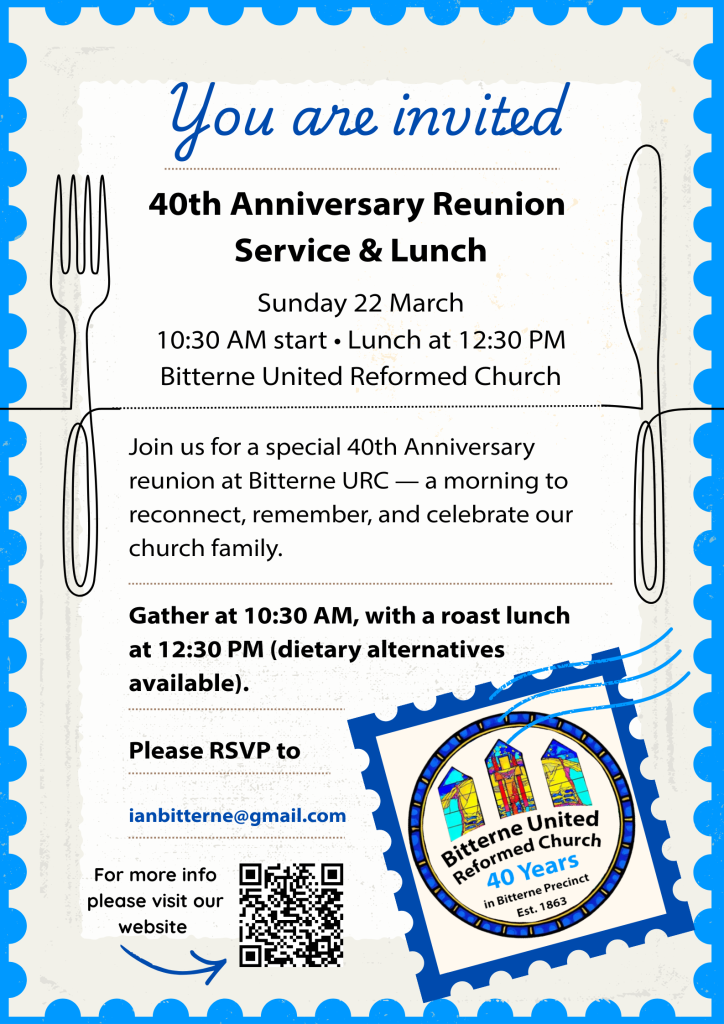 ABBEY URC – Sunday 15 February 2026 at 10.30 am, A Celebration of Love – led by the Reverend Terry Hinks. Abbey URC is open every Saturday morning for a quiet time of prayer and meditation.